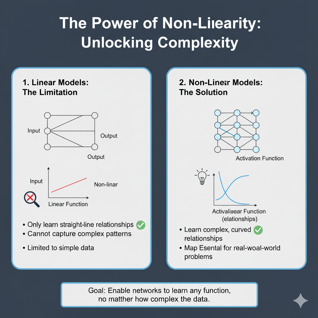 Analogy: Think of building with LEGO. Linear transformations are like having only straight bricks. You could only build walls. Non-linear activations are like adding curved bricks, hinges, and gears. Suddenly, you can build cars, castles, and robots.