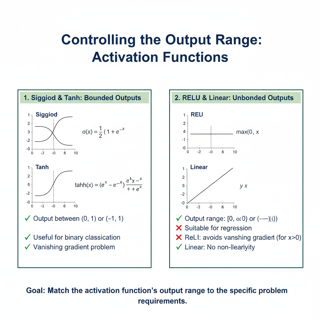 2. Controlling the Output Range: Different Activation Functions constrain the output to a specific range (e.g., 0 to 1, -1 to 1). This is vital for stability in training, especially in the output layer. For instance, a sigmoid function is ideal for binary classification as it squashes outputs into a probability between 0 and 1.