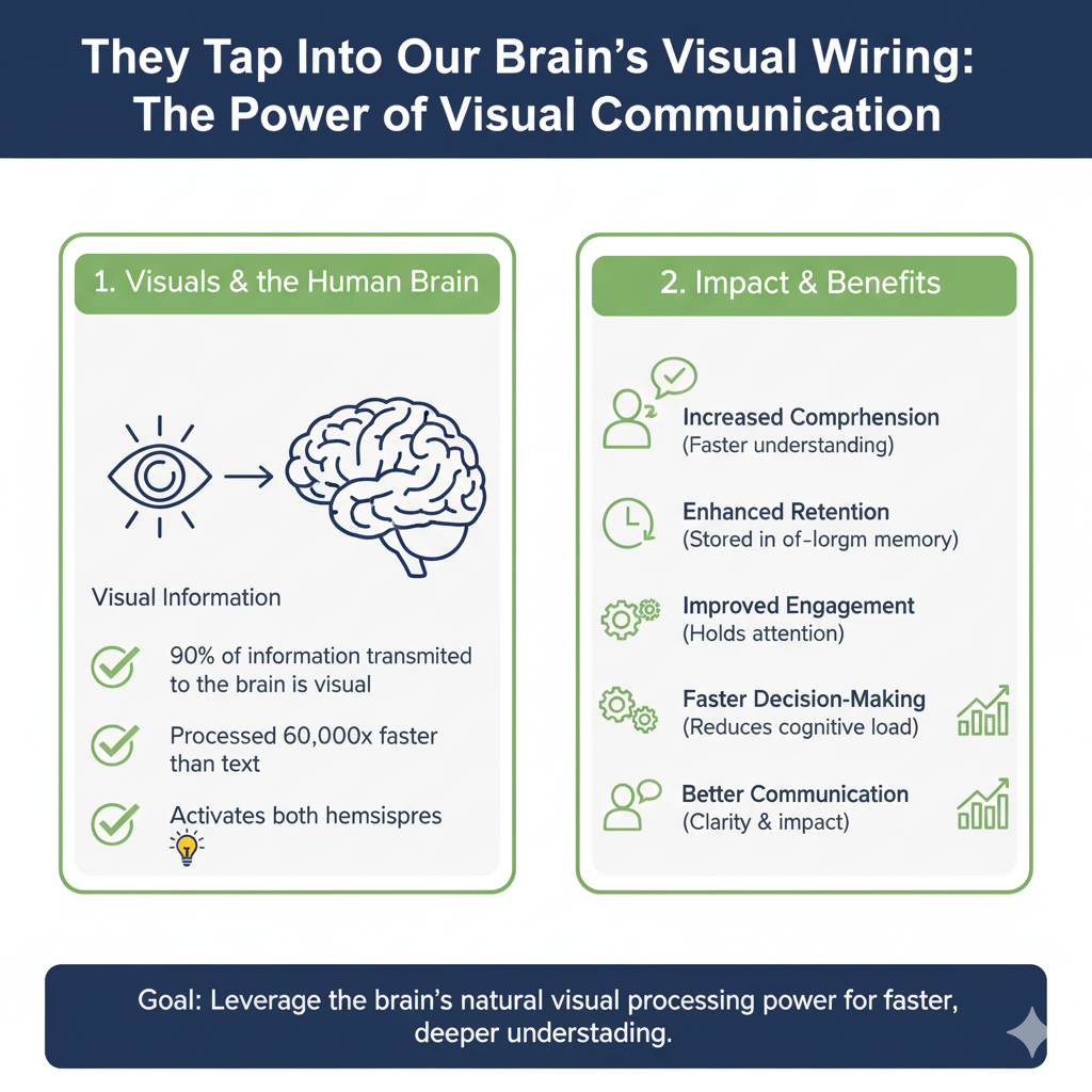 Our brains are not primarily designed to process walls of text. We are visual creatures, and this isn’t just an opinion—it’s a biological fact. A staggering 90% of the information transmitted to our brain is visual, and our brains process images an astonishing 60,000 times faster than text.