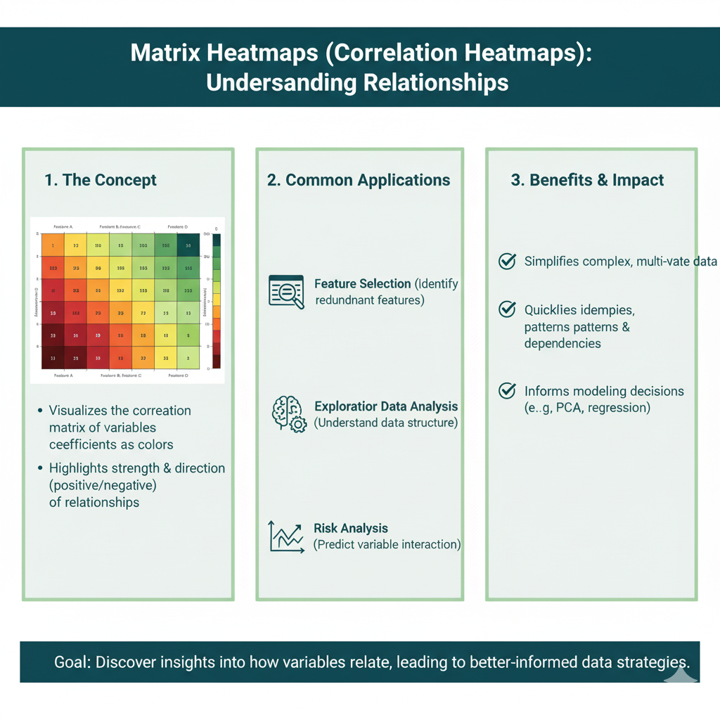 - What it looks like:Â A grid of squares, like a chessboard. Each square’s color represents the relationship or correlation between the item on its row and the item on its column.