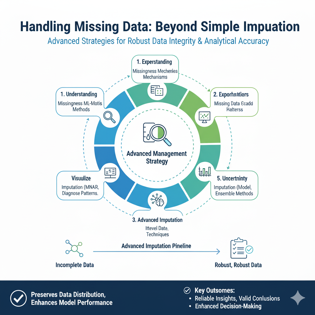 Strategic Imputation Techniques should match the missing data mechanism and your modeling goals. For data missing completely at random, mean/median imputation might suffice, though it underestimates variance. For data missing at random, consider regression imputation where you predict missing values based on other variables. Multiple imputation creates several complete datasets and combines results, preserving statistical properties better than single imputation. For categorical data, consider creating a “missing” category rather than imputing modes, as the missingness itself might be informative.