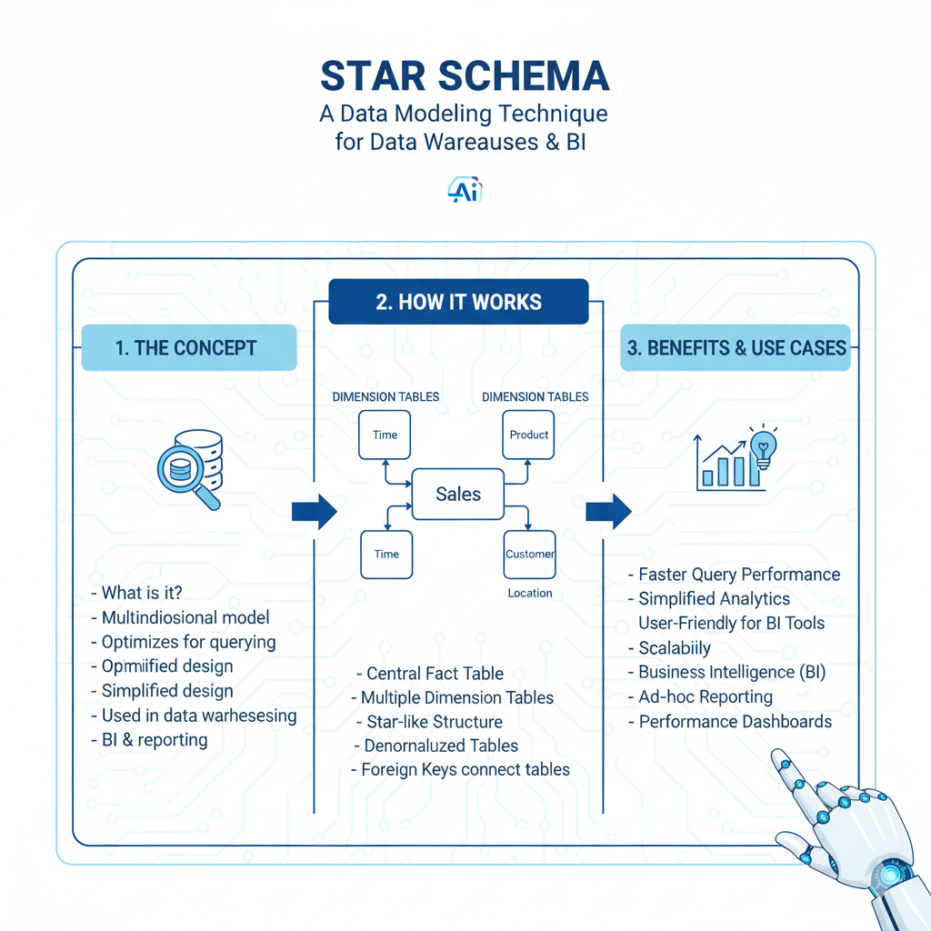 The Star Schema is the most common and user-friendly data modeling technique for data warehouses and analytical databases. It’s designed for one thing: making queries fast and simple.